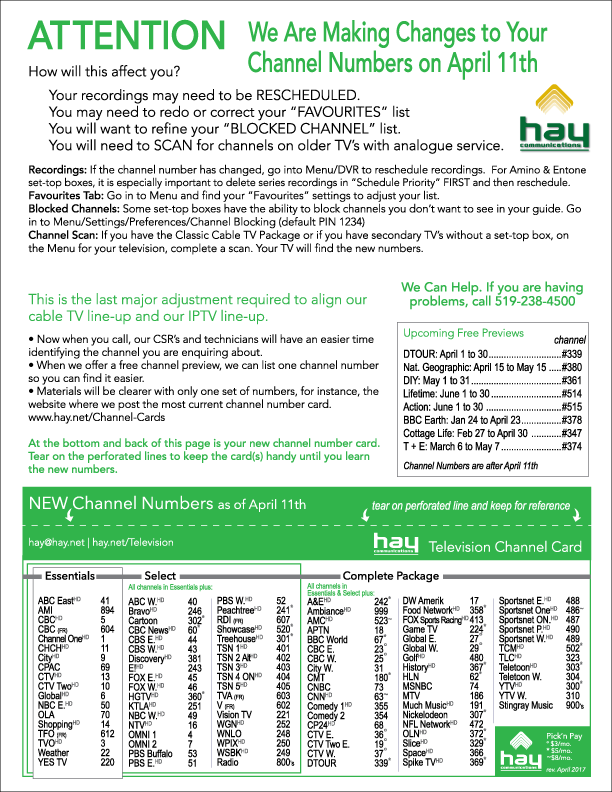 Work will happen between 11PM April 10th and midnight. Most of the Cable TV STBs should refresh over the night and take the new channel lineup by the morning.