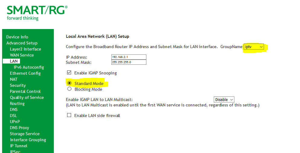 2) Go to Advanced SetupLAN and select the GroupName IPTV